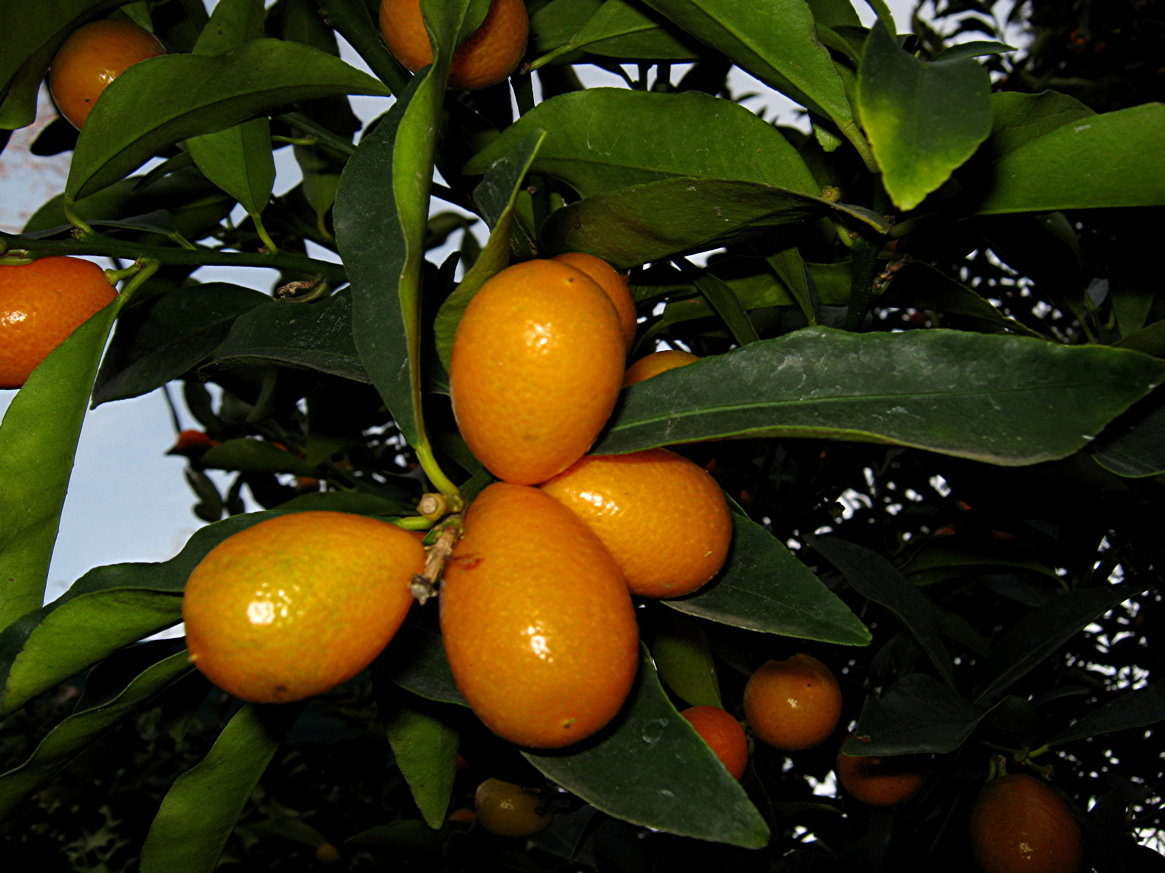 Nagami has bright orange fruit shaped like an olive. Very ornamental; best-known type. Meiwa has sweet, round fruit.