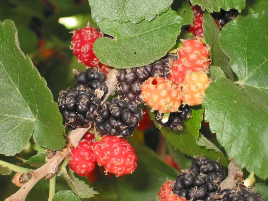 is the black mulberry, including Russian, Persian, and Pakistani varieties. Slow-growing small trees to fifteen feet, easily kept lower. Large, soft, juicy, intensely sweet-tart fruit resemble giant blackberries. Birds love them. Fruit stains fingers, sidewalks, and clothing. Does not reseed.